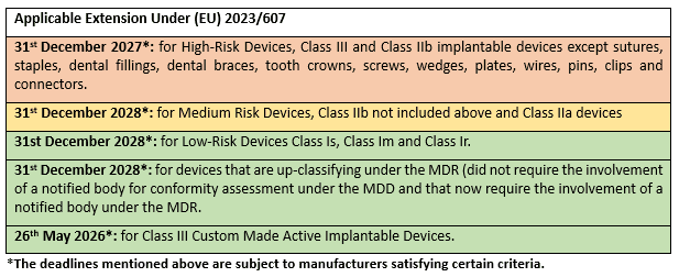 Firstly, we would like to remind our clients of the MDR extension which came into force in March of last year. To offer some background to this extension, the EU commission proposed an extension in the transition periods due to concerns of medical device shortages on the EU market as a result of medical device manufacturers not having enough time to comply with the MDR requirements. The proposal faired quite well and was adopted and published in the official journal of the EU on the 20th of March 2023 and can be accessed using the following link (EU) 2023/607