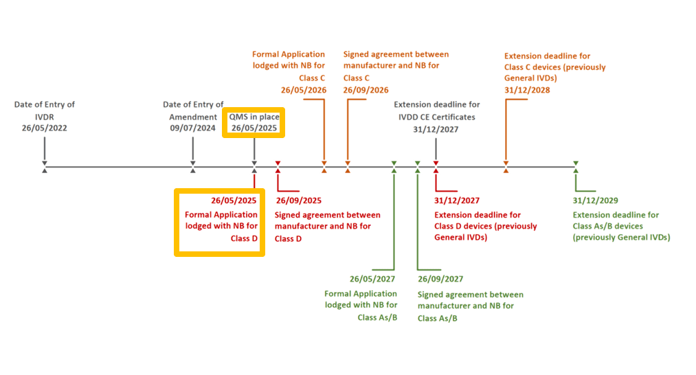 - Submitting a formal application: For Manufacturers of Class D IVD devices, a formal application to a Notified Body for the conformity assessment of their devices must be submitted by 26th May 2025.